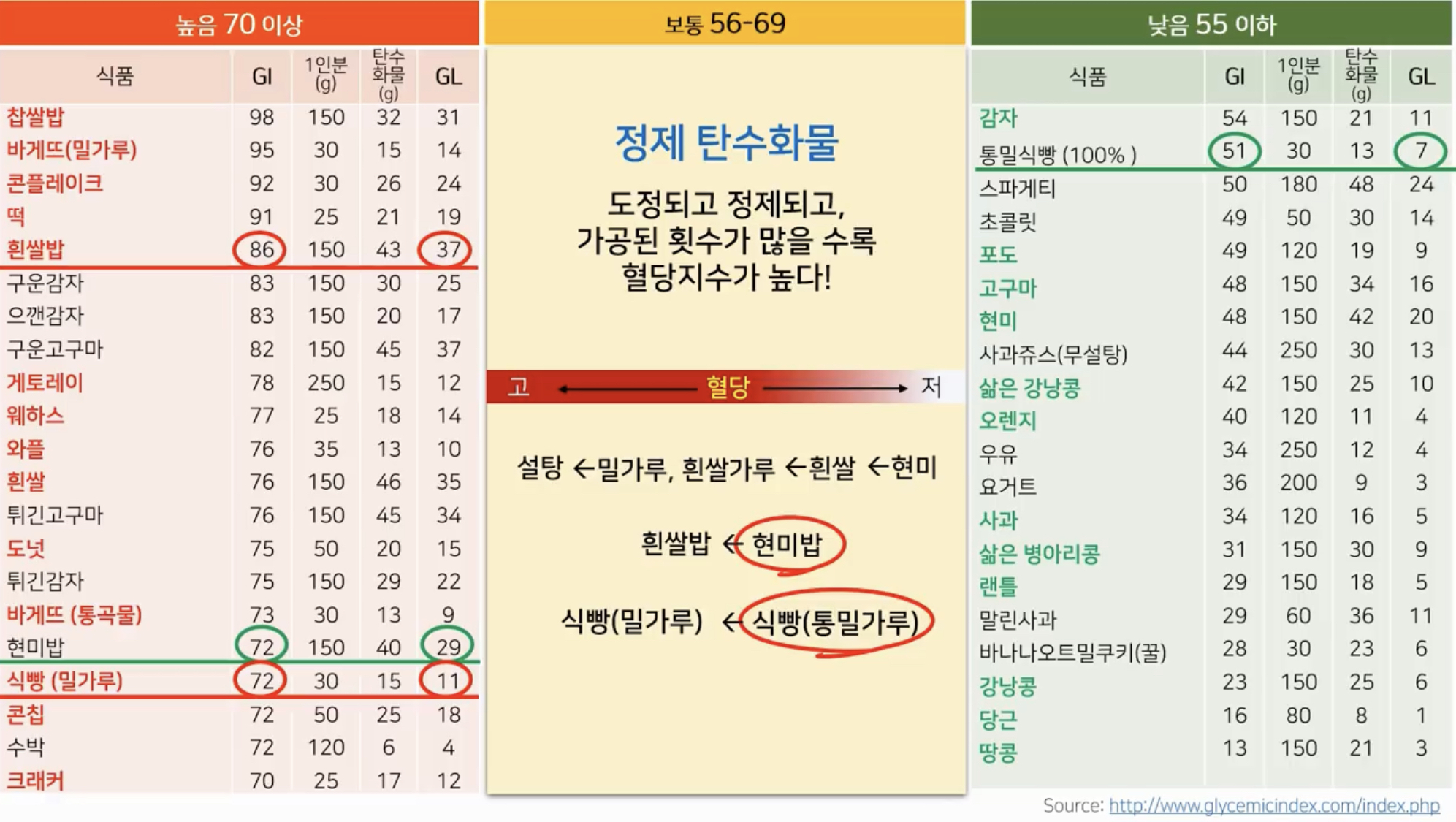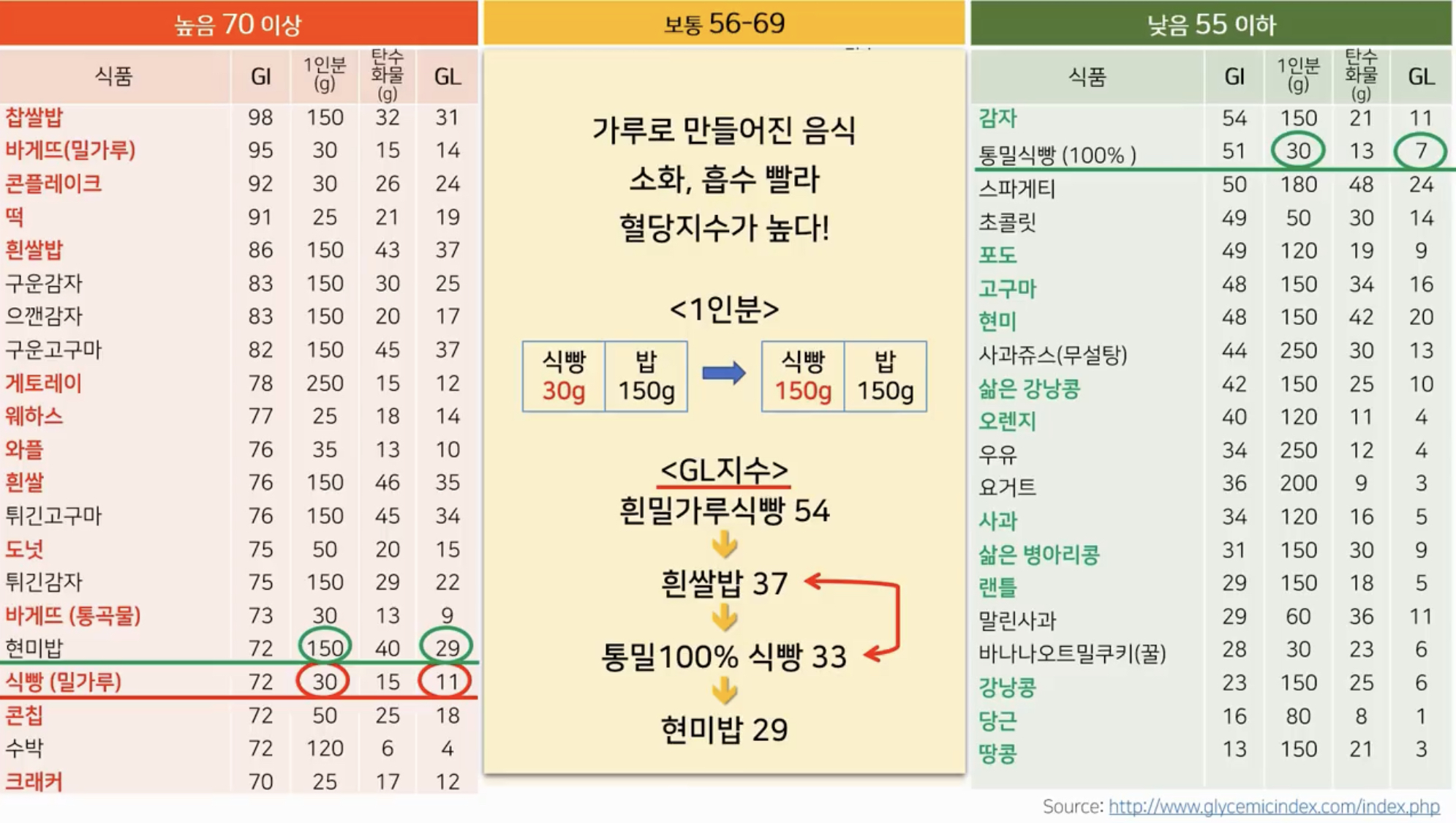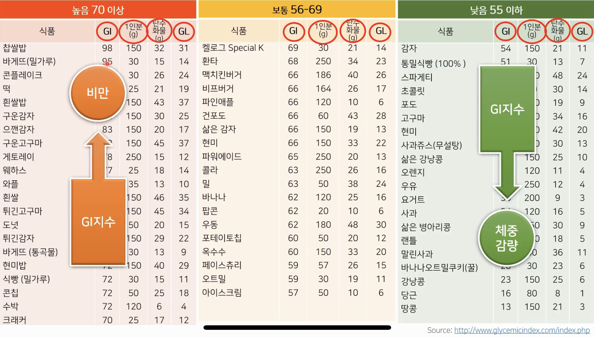 실제로 GI지수, GL지수가 나와있는 표를 같이 보면서